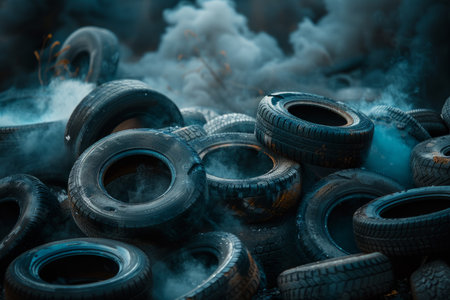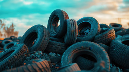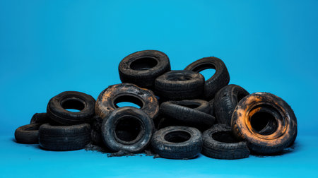 A striking image of a disorganized pile of old tires on a vibrant blue background. This photograph captures the urgency of recycling and environmental discussion.