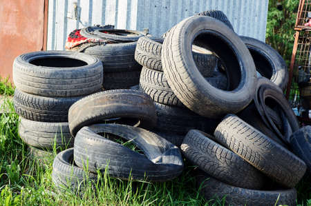 A bunch of old tires from used cars. Environmental pollution. Dump tires