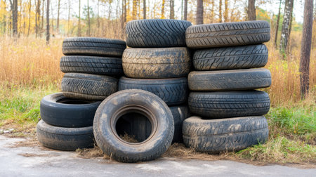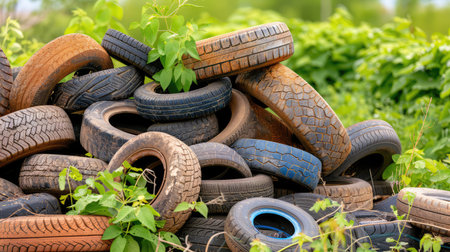 A visually striking image showing a pile of old tires nestled among vibrant greenery, highlighting environmental concerns and waste management.