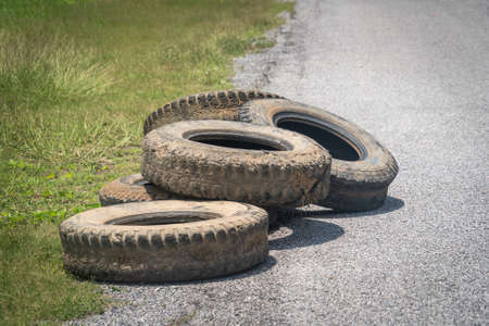 Old used tire stacked on street.