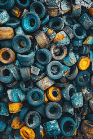 This image showcases a vibrant collection of old tires in various colors and conditions, emphasizing recycling challenges in contemporary environments.