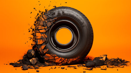 3d rendering of a damaged car tire on an orange background.