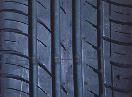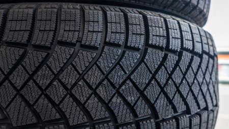 Tires close up. Black studdable winter tire profile. Car tires in a row.