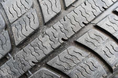 Shallow depth of field (selective focus) image with details of a dirty winter tyre in a car workshop. Sipes and cuts in the tread highlighted.