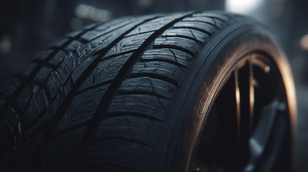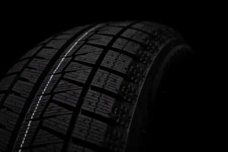 Dusty automobile tire tread on black and dark blue background, horizontal close up shot, copy space