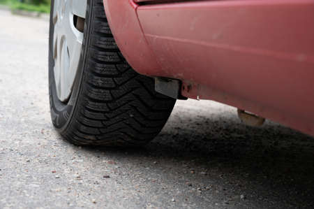 Car wheels close up on a background of asphalt. Car tires. Rear-side view of car