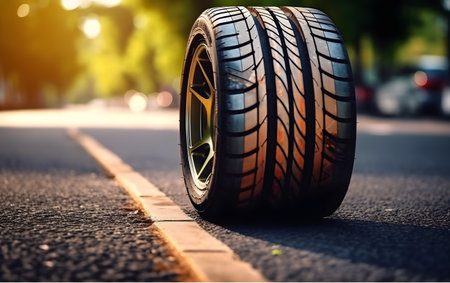 Close up beside tire of car on asphalt road. Rubber patterns with stones have been used on the road.
