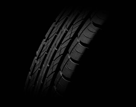 Car tire in dark color. Night shooting. The tread is summer. Light falls from above.