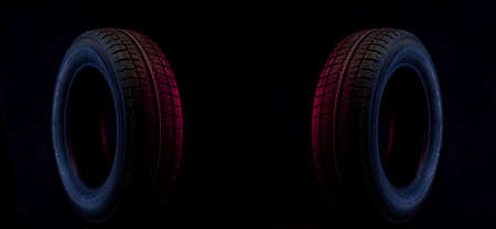 tires with a tread for winter driving on a black background with an image of red-blue illumination