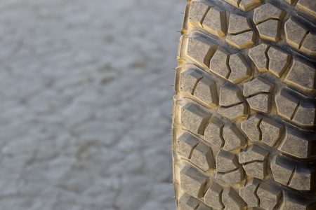 Closeup view of an off road tire tread on a dry lake bed