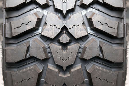 Close-up on the tread of a black tire for an SUV with a rough pattern on rubber. Brutality, rudeness and stiffness of men.