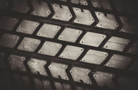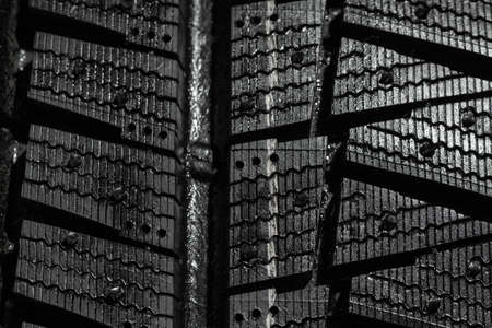 Macro shot winter studded tire. Winter car tires texture. Tyre protector close up. Square powerful spikes. Black studdable winter tyre profile. Car tires