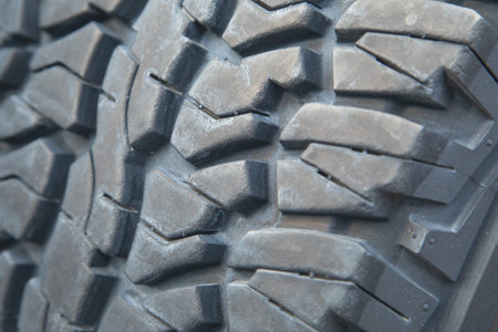 Off road tire pattern or thread on an SUV or truck wheel. Close up, low angle view, no people