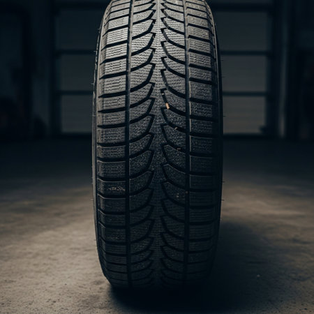 Editorial extreme close-up macro photograph of two vertically resting, new snow tires in a dimly lit
