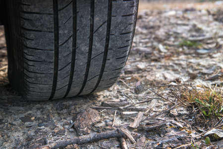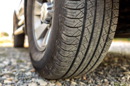 Closeup of a car tire on a road. Selective focus.