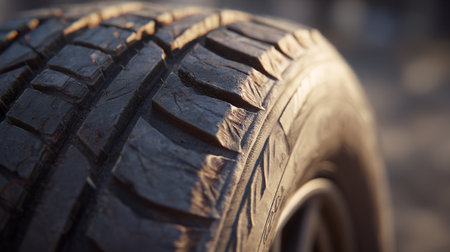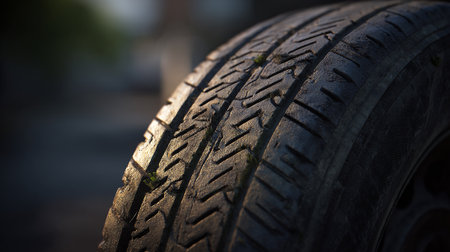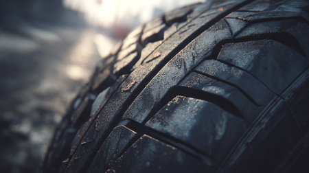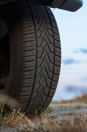 Close-up of car tire, selective focus, shallow depth of field