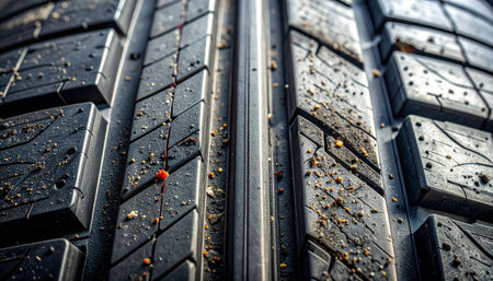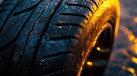 A striking close-up image showcasing the intricate texture of a wet tire tread, illuminated by soft light. The photo captures the unique patterns and reflections, emphasizing the tire's detailed design and rubber material. Perfect for automotive themes or backgrounds related to vehicles and travel.