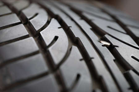 Metal spike head on flat tire macro close up view on blurred background