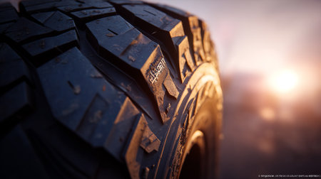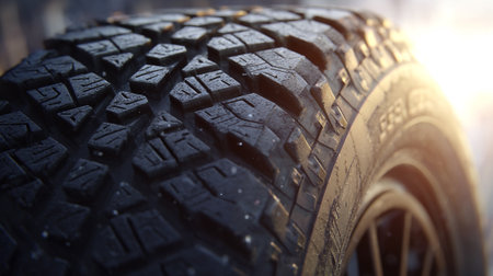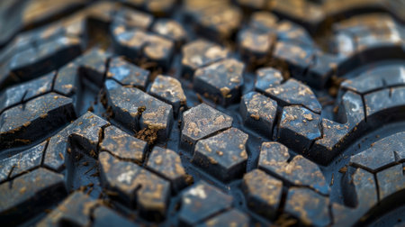 A detailed macro perspective reveals the intricate patterns and rugged texture of a vehicle's tire tread.