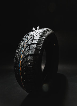 Winter tire on a black background with a snowflake resting on top for seasonal illustration