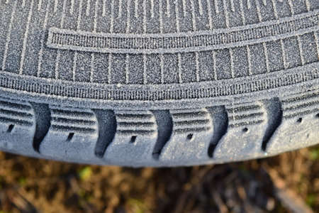Hoarfrost on a rubber tire wheel. Morning frost.