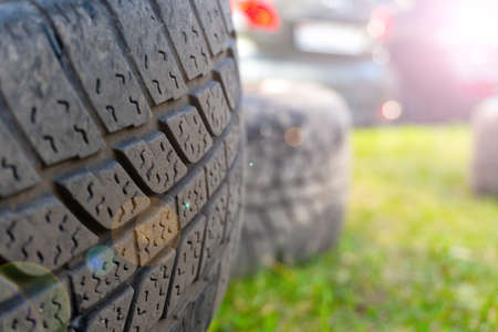 Tires from the car, worn summer tires. Selective focus. nature.