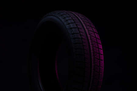 Car tire in dark color. Night shooting. The tread is summer. Light falls from above