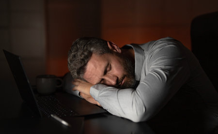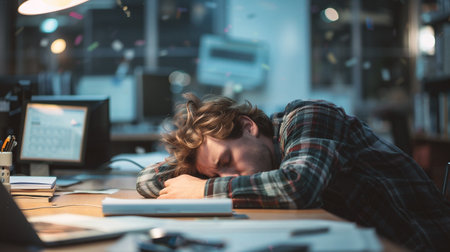 Exhausted employee sleeping on desk with head on arms, overwhelmed by stress and fatigue in modern office after working on laptop, highlighting need for better time management
