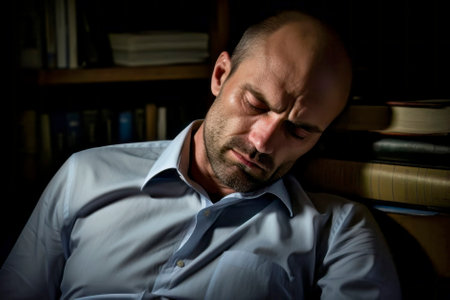 A tranquil image capturing a close-up of a man peacefully asleep amidst the books in a library.