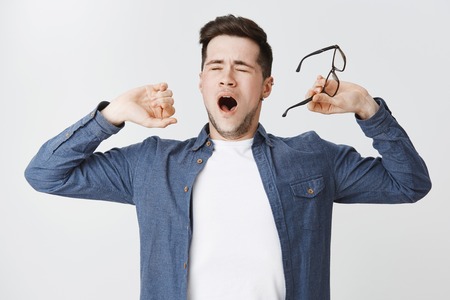 Portrait of tired attractive male student taking off glasses closing eyes and yawning while stretching as feeling exhausted and sleepy, working on project at night falling asleep dreaming about nap