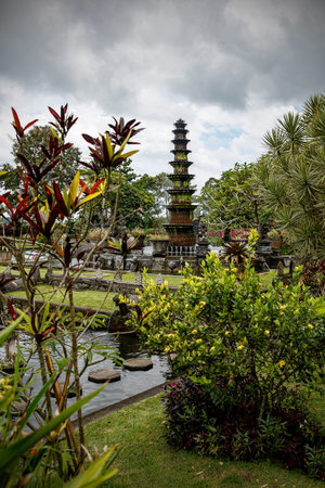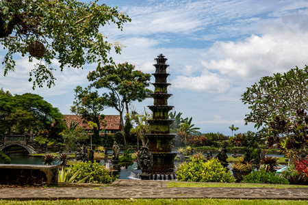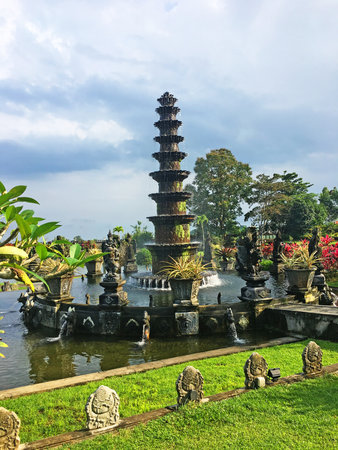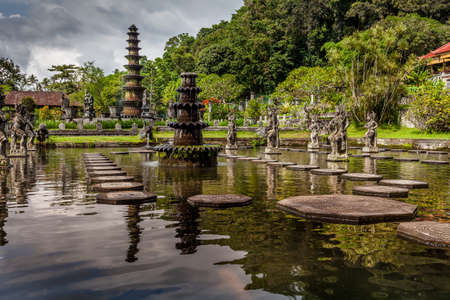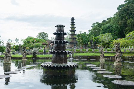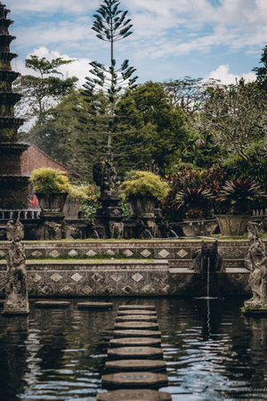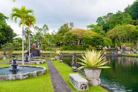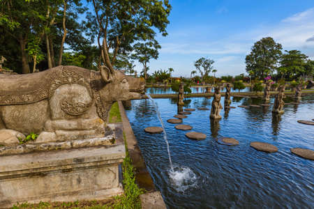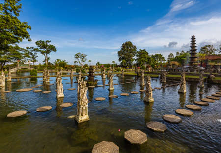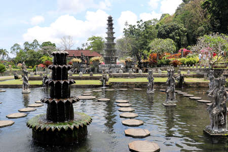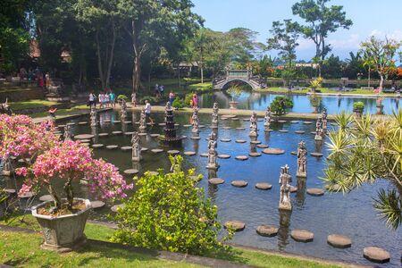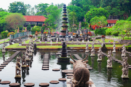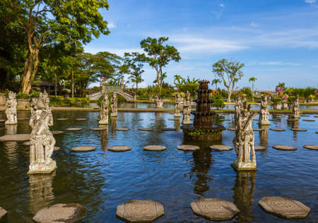 Bali, Indonesia - May 3, 2017 : Tirta Gangga, the former royal water palace is a maze of pools and fountains surrounded by a lush garden and stone carvings and statues near Karangasem, Bali, Indonesia