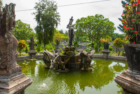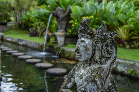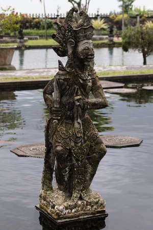 Hindu Balinese Water Palace Tirta Gangga with statues of the gods, fountains on Bali island, Indonesia. Tirta Gangga the former royal water palace is a maze of pools and fountains surrounded by a lush garden and stone carvings and statues.