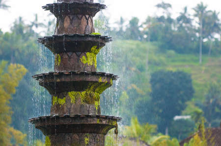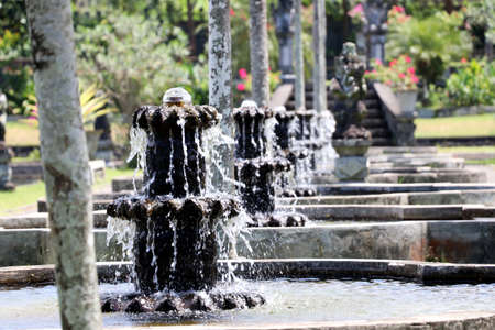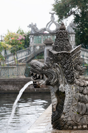 Spouting Fountain with sparkling drops of water in Bali water palace gardens of Tirtagangga temple. Traditional Balinese sculpture and architecture elements.