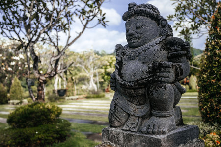 Unique statue of human deityb warrior or demon carved of stone in beautiful park Tirta Gangga on Bali, vertical. Majestic antique culture monument of balinese, religion and history.