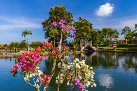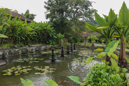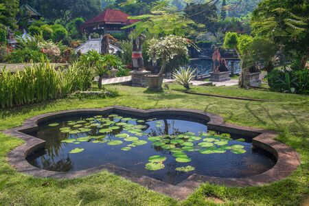 Tropical park around the pond in Tirta Gangga complex, Bali, Indonesia