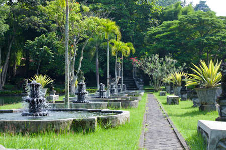 empty tropical background - park alley with road, fountains, benches, exotic plants, stairs and sculptures in Bali, Asia