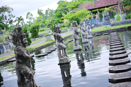 Traditional Balinese Warrior's Sculptures in sacred garden of Tirtaganga, Bali. Some sculptures are in open water and some trees and flowers around.