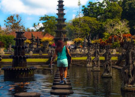 Young beautiful woman in Taman Ujung water palace, Bali island, Indonesia