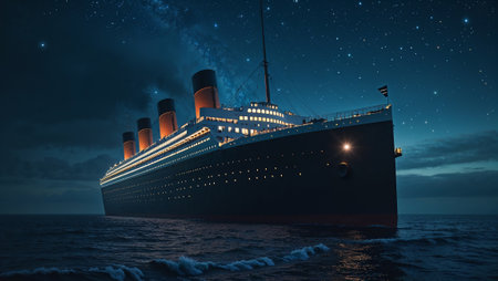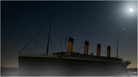 Dramatic night scene of the titanic wreck amidst city ruins and moonlit sky with cinematic effects