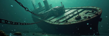That the image is generated using AI. Submerged shipwreck underwater with chains and bubbles.