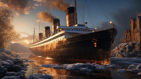 Impressive Cruiseship Titanic Among Ice Floes extreme closeup. Generative AI