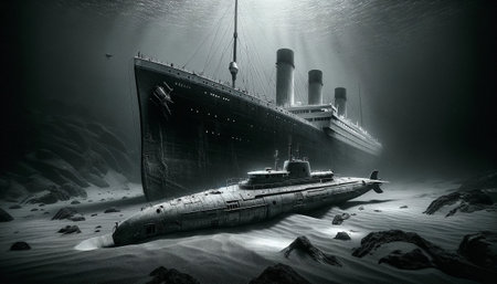 Deep beneath the ocean's surface, the Titanic rests in eternal slumber, its rusted remnants a haunting reminder of a tragic tale illustration generative ai