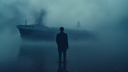 a person stands near a ship in the fog, with a man standing behind it. the photo captures the essence of b-movie aesthetics, with its dark cyan tones and classic portraiture style. the berlin secession influence is evident in the luminous shadows and matte painting effect. the powerful and emotive portraiture adds depth to the image. ai generated
