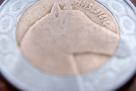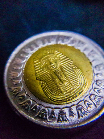 Macro big closeup photo for one Egyptian pound metal coin face, shot is selective focus with shallow depth of field, blurred background, taken at Cairo Egypt