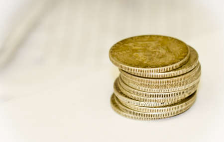 This stack of old silver coins sits on a bulrred, isolated background, suggesting old money, wealth or savings.