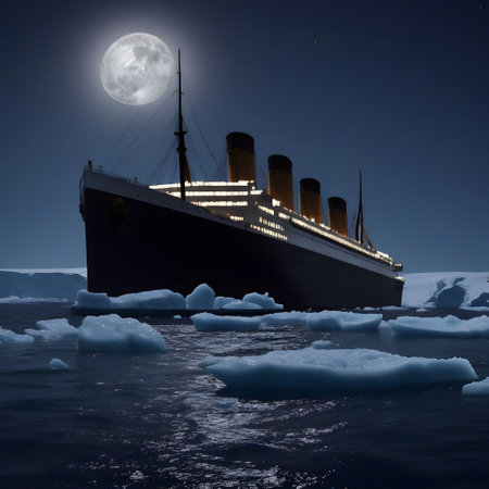 Dramatic night scene of the titanic wreck amidst city ruins and moonlit sky with cinematic effects