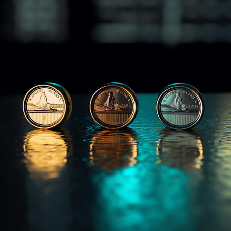 Coins placed in a linear pattern on a dark background create a striking visual contrast.