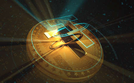 Concept of Tether coin against golden bitcoin coins. Tether is backed by US dollar and used for trading in alt coins