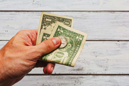 Paying debt concept - male hand giving somebody just two US dollars and a quarter. Old used banknotes, rough skin.