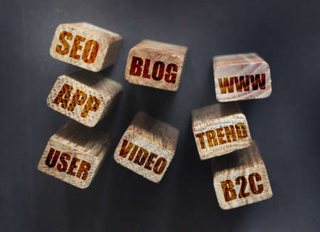 SEO blog video app www B2C words on wooden blocks. Search engine optimization internet marketing concept.